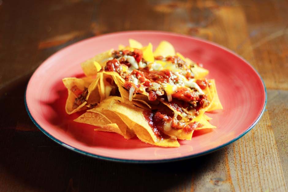 Nachos (triangoli di mais fritti) con formaggio fuso e con carne molida (carne trita stufata con spezie).