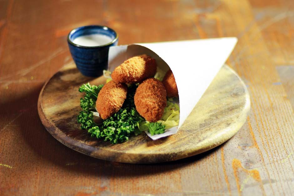 Cinque croccanti peperoncini rossi piccanti ripieni di formaggio panati e fritti.